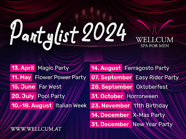 Unser Wellcum ist nicht nur ein SPA für Erwachsene, sondern auch ein Ort, um unbeschwerte Stunden voller Spaß und Unterhaltung zu verbringen, bei guter Musik und gutem Essen. Jeden Monat bieten wir mindestens ein FKK Club-Event, zum Beispiel eine Themenparty mit Unterhaltungsprogramm, Darbietungen von externen Künstlern oder klassische Pole-Dance-Aufführungen von den Girls, die im Club arbeiten. Es gibt auch Live-Konzerte, DJ-Sets, spezielle Menüs und internationale Gäste aus der Welt des Adult Entertainment. Der Veranstaltungskalender wird immer zu Beginn des Jahres bekannt gegeben, damit Sie Ihr Hotelzimmer oder Ihr Eintrittsticket im Voraus buchen können. Für alle, die Menschenmassen lieber meiden, bleibt unser Erotikhotel in Österreich an weiteren 352 Tagen im Jahr ein Paradies der Erholung.
