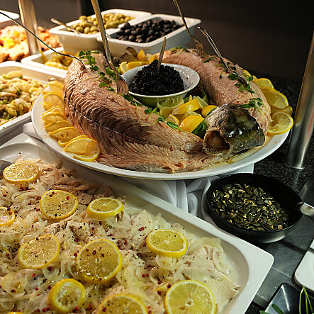 During lunch hours, our chefs set up a hot and cold buffet. In the evening, dishes are cooked by the chef in front of your eyes. In the summer, every Thursday and Sunday from 6 pm onwards, barbecued meats are served. If you are in a group of at least 6 people and want special service, you can order à la carte. Upon advance request, we create special dishes such as prawns, crabs, lobster and more of your choice.